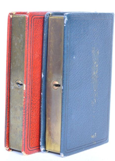 Two vintage mid 20th century faux leather Lloyds Bank Ltd money banks / money boxes. The lot to include a blue and a red money box with one key opening both. Each box measuring approx. 12 x 7.5 x 2cm.