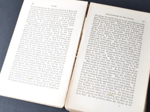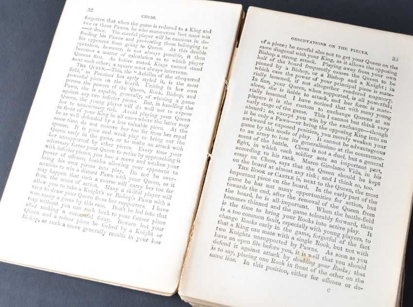 (1). Chess: Its Theory and Practice, Rawdon Crawley, front board, title page and copyright missing. Slight foxing front/rear pages. Circa 1876.  (2) The Perfect Chess Player, Complete Manual for this Game, Theory and Practical extracted from the best authors.  Ordered by Judge Henrique Velloso D'Oliveria.  Published by Eduardo E Henrique Laemmert 1850.