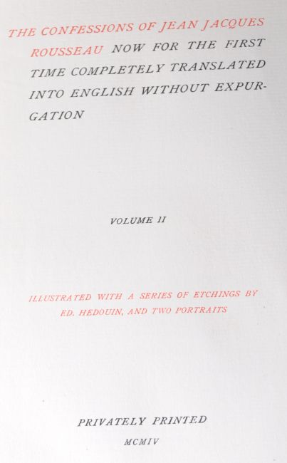 The Confessions of Jean Jacques Rousseau. 1904. Jean Jacques Rousseau. Published by Privately Printed. Translated into English, two volume book.  Illustrated with a series of etchings by Ed[ouard] Hédouin, and two portraits. golden yellow buckram, pp.281, tissue-guarded portrait frontispiece, six guarded etchings; pp 414, tissue-guarded portrait frontispiece, seven guarded etchings, printed paper labels on spines, fore- & tail edges untrimmed.  Edges dust-soiled, labels darkened & a little rubbed, internally fresh.