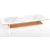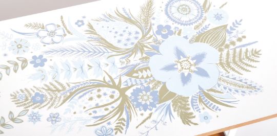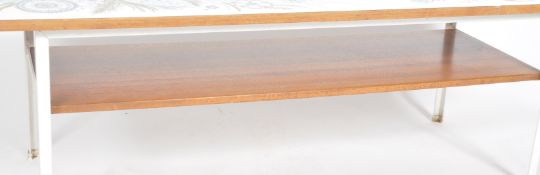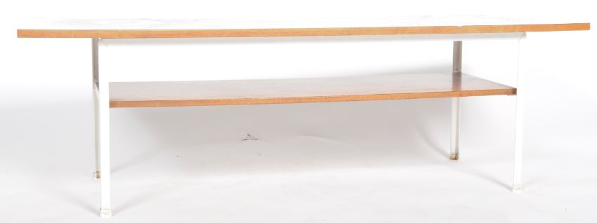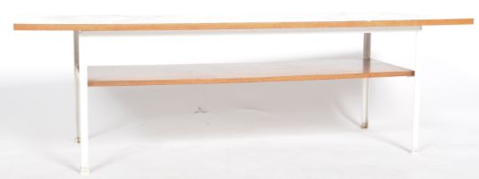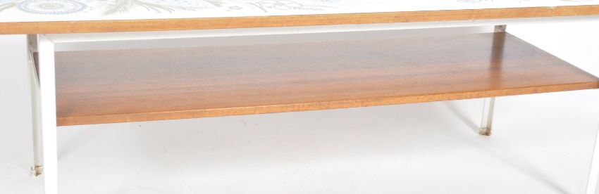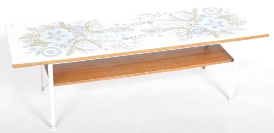 Terence Conran - Habitat - A retro vintage 1960s formica topped coffee table / low table having a white ground with  central floral decoration. Teak magazine rack second tier below with all raised on white metal supports. Measures approx; 36cm x 114cm x 38cm.