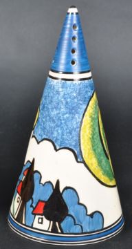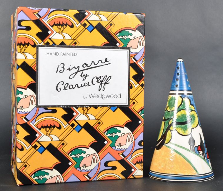 A Wedgwood Clarice Cliff Trees and House Conical Sugar sifter / shaker from the Biyanne range. Hand painted in vibrant Art Deco colours with conical shape and having holes to top and base. Marked to base. Complete with certificate and box (459/500). Measures approx; 14cm tall. No visible damage.