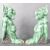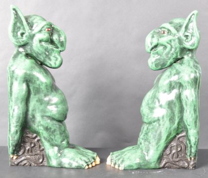 A pair of 20th Century studio art pottery / plaster figural bookends depicting grotesque goblin / gargoyles. Each with Terry Pratchett style features with green glaze and red painted eyes. One having wart to chin. Signed to bases. Maker unknown. Measures approx; 27cm tall.