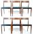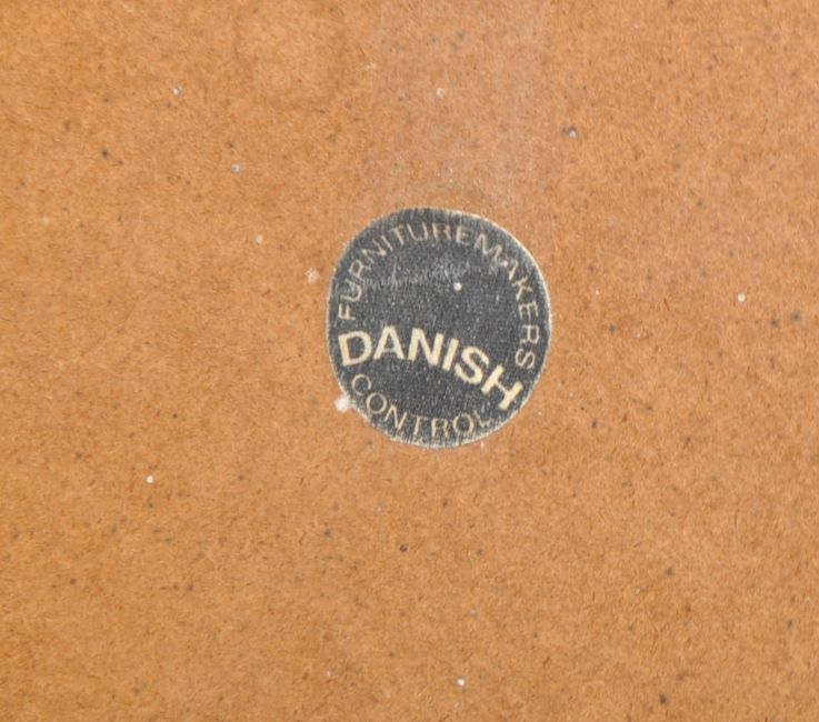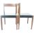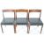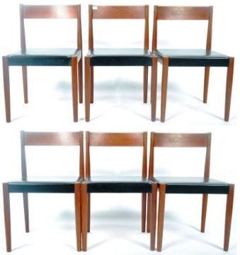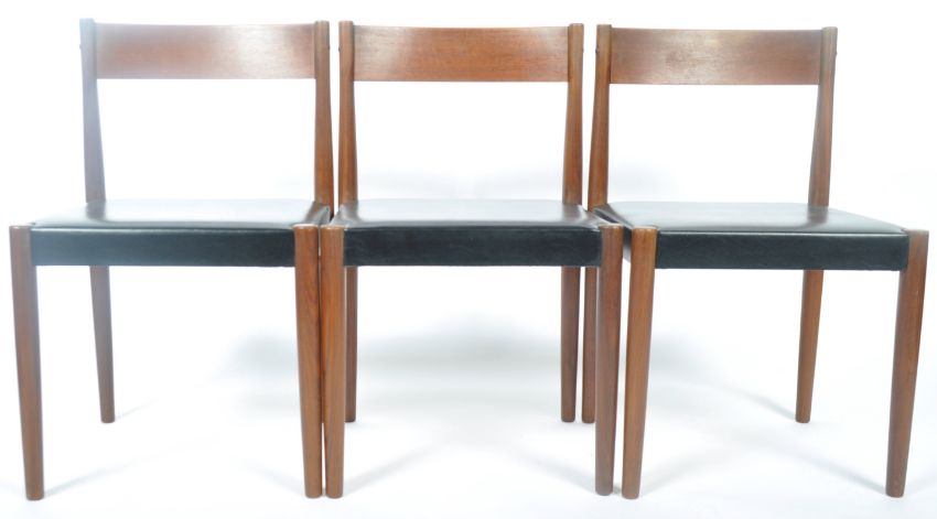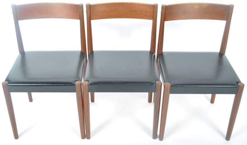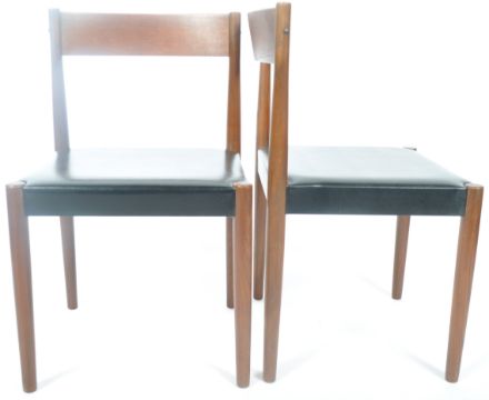 Poul Volther - Frem Røjle - A matching set of six retro vintage mid Century dining chairs of teak wood construction with each having a single curved backrest supported by two cylindrical columns terminating into the legs. All raised on tapering supports with faux black leather seats. Labels and stamps to undersides. Wear commensurate with age. Each chair measures approx; 77cm x 47cm x 43cm.