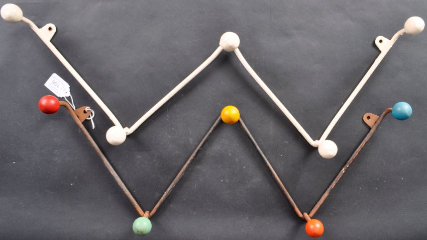 A retro vintage mid 20th Century sputnik atomic coat hooks / rack of 'W' shape form with painted multi coloured wooden ball finials and black finished tubular support, together with a entirely white painted coat rack. Wear commensurate with age. Measures approx. 51cm x 56cm.