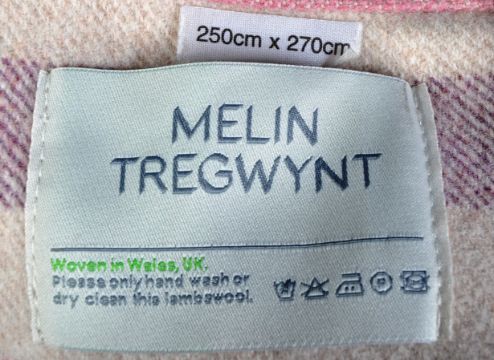 Vintage Melin Tregwynt Knot, long striped pattern in two shades of pink, purple and off white.  100% British lambswool.  Made in Castle Morris, Pembrokeshire by Melin Tregwynt.  This intricate reversible weave was originally created in the 1950's, with help from the rural industries board. It forms part of the MT archive and has been woven at the mill since the 1960's. Moth damage present however this does not detract from the overall aesthetic of the blanket.  Approx: 250cm x 270cm. Together with The Swando, a vintage wool blend, British made, apple and forest green, pink and cream checked design. 237cm x 210cm.