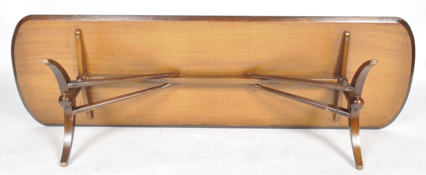 Everest for Heals of London - Long Tom - A retro mid 20th Century afromosia teak, satinwood and marquetry coffee table. The top with abstract modernist design raised arched feet. Measures approx; 37cm x 151cm x 46cm.