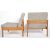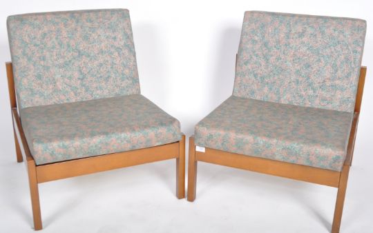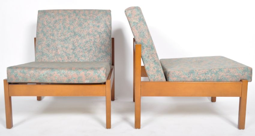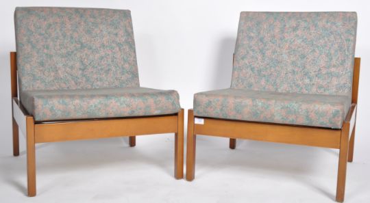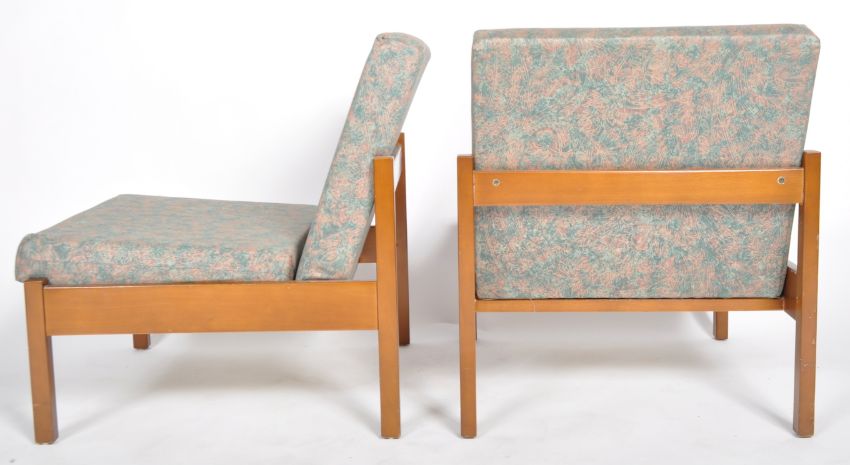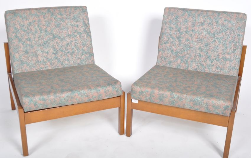 A matching pair of retro 20th Century stained beech wood easy lounge chairs / cocktail / bedroom chairs having floral upholstered seat and back cushions. All raised on straight leg supports. Wear commensurate with age. Each chair measures approx; 73cm x 63cm x 70cm.