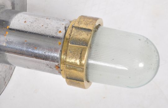 Chrome and Brass Hanging Lamp. Brass hanging fitting, chrome bar body with large cylindrical main frame, fitted plate " Prov Pat 32305 39 GEC Made in England ". Screw in glass shade fixed with brass fitting rim. Measures approx: 54cm x 19cm x 19cm.