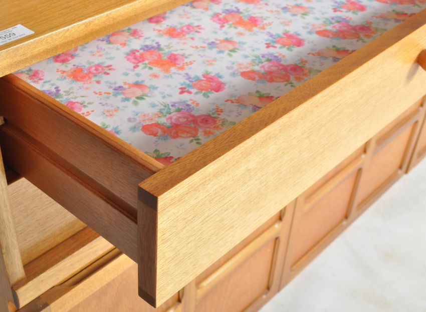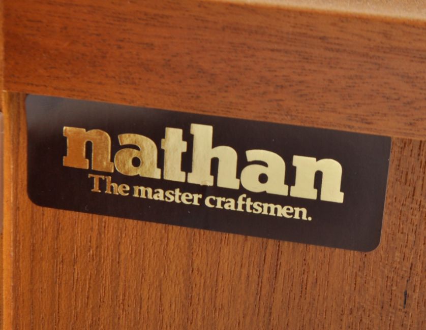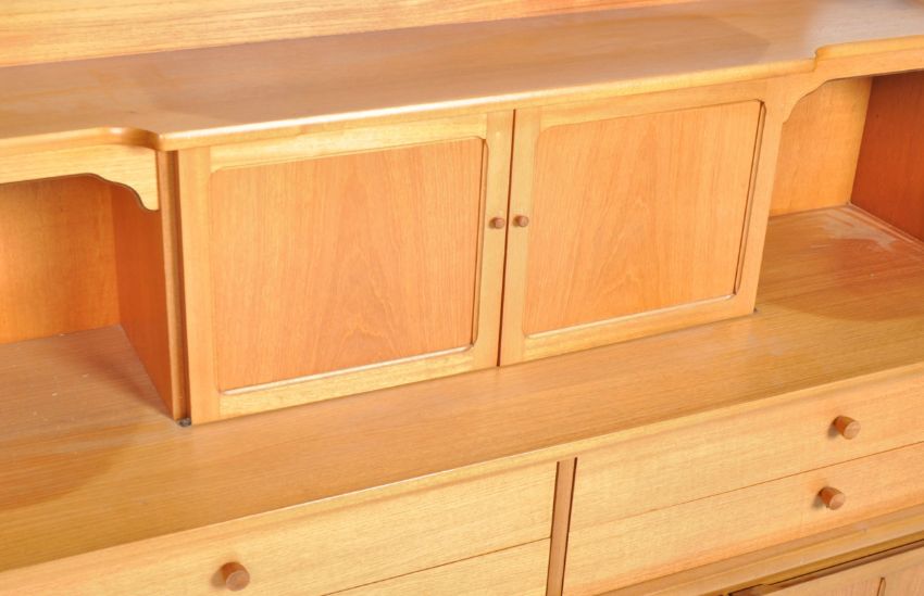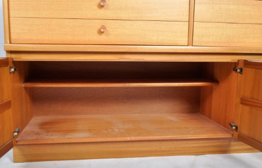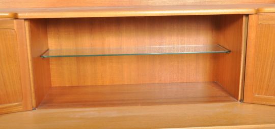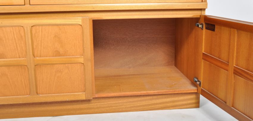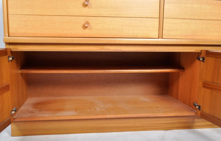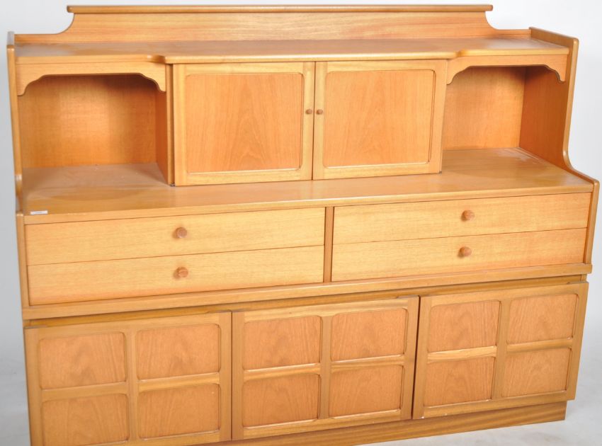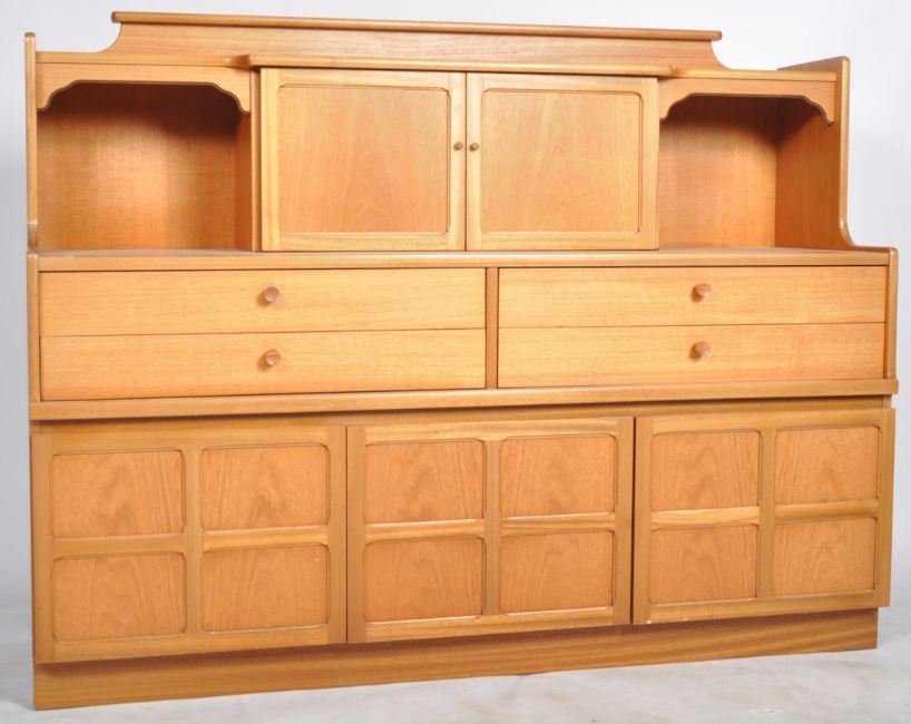 Nathan - Squares Pattern - A retro 20th Century teak highboard / sideboard credenza having a central cupboard top flanked by open section and pediment top. Below four drawers above cupboard doors below with all raised on a plinth base. Measures approx; 110cm x 153cm x 45cm.