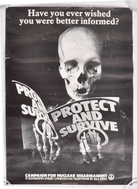 Nuclear Disarmament - An original vintage 20th Century 1980s peace poster campaigning for Nuclear Disarmament. The poster depicting a skeleton reading an issue of Protect and Survive. In rolled condition. Measures approx; 57cm x 41cm.