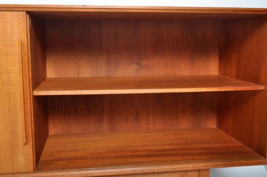 A large 20th Century Danish design teak wood sideboard credenza having a central bank of four drawers flanked by sliding door cupboards to each side with all having angled handles. All raised and supported upon six legs. Measures approx; 73cm x 230cm x 43cm.
