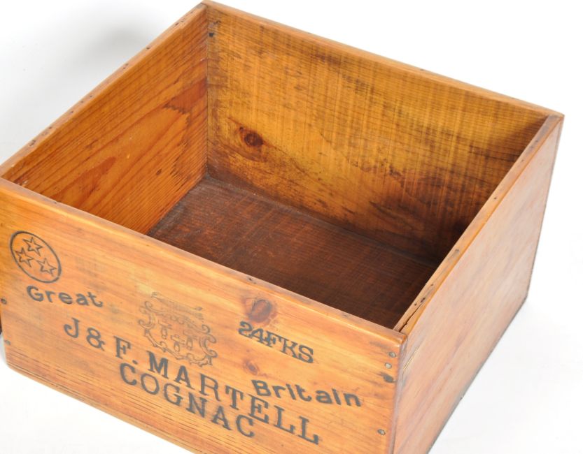 A pair of vintage shop advertising display wooden shipping / storage crates: to include a Cognac crate and Tetley tea crate.  Measures approx: 28cm x 44cm, 31cm.