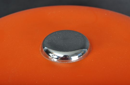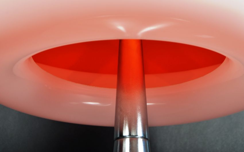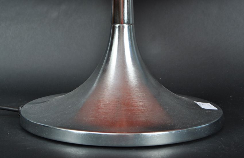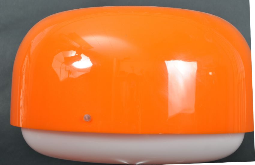 Luigi Massoni for Harvey Guzzini - Medusa - A retro 20th Century 1970s Italian design table / desk lamp light of mushroom form having a vibrant orange shade and white shade diffuser all raised on brushed metal tulip base. Measures approx; 40cm x 36cm diameter.