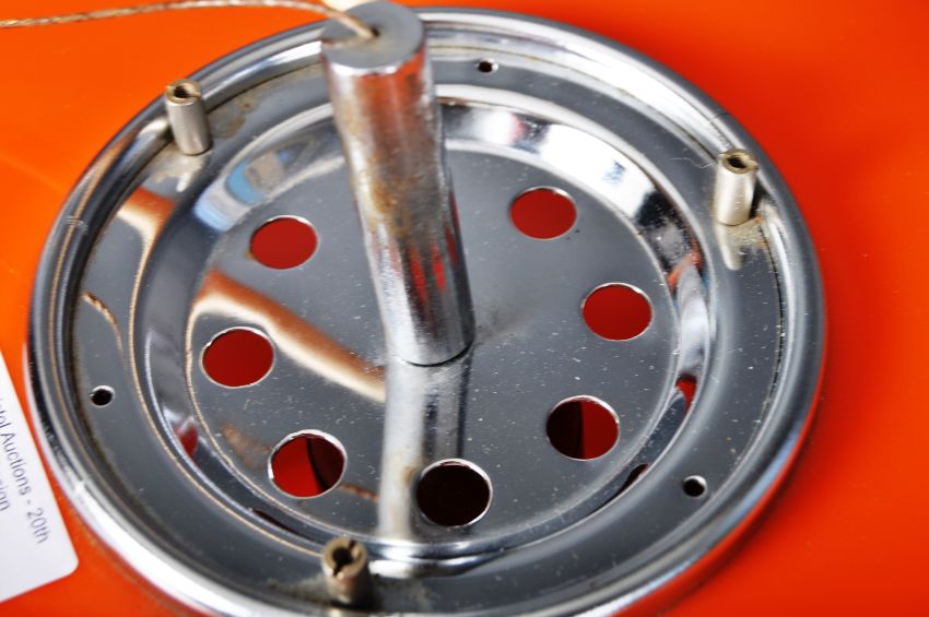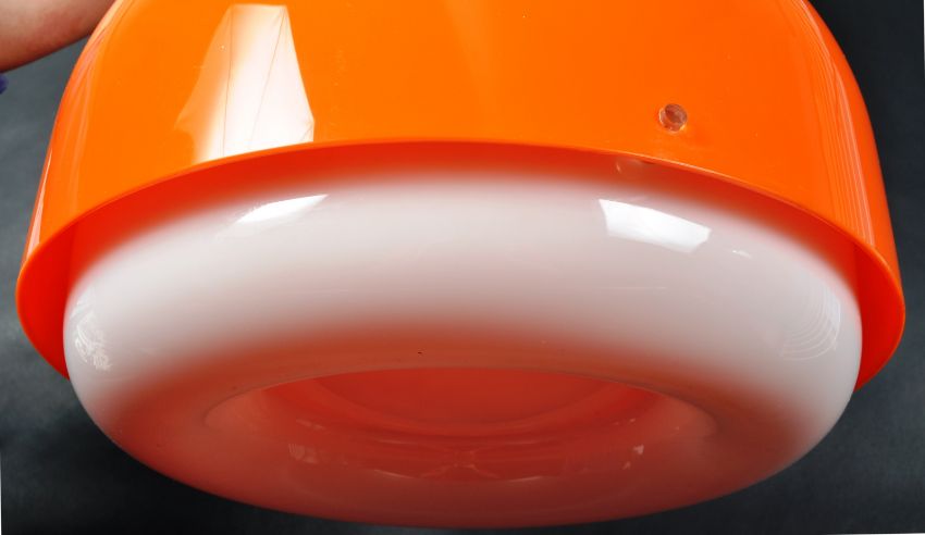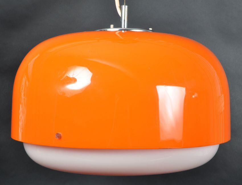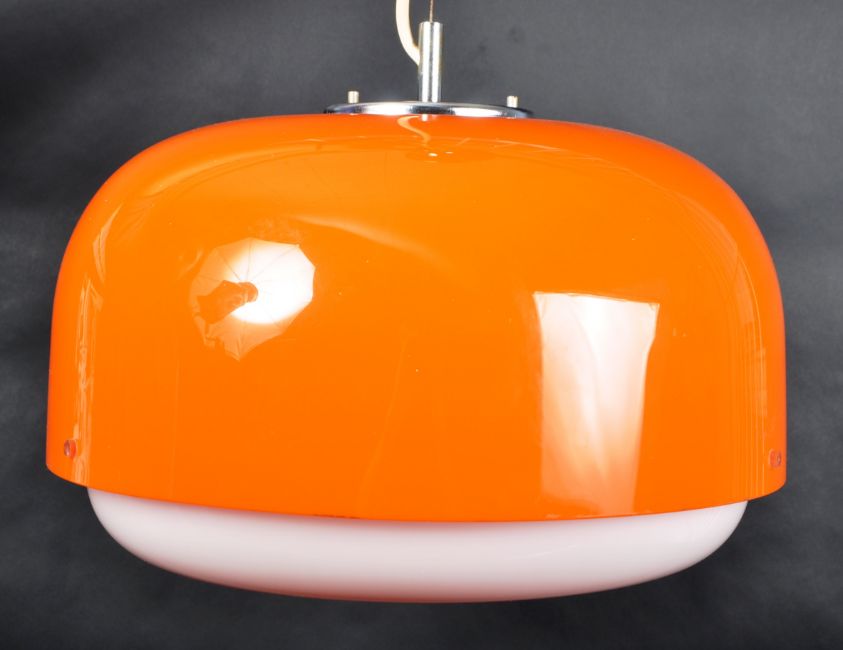 Luigi Massoni for Harvey Guzzini - A retro 20th Century 1970s Italian design hanging ceiling light of mushroom form having a vibrant orange shade with white shade diffuser. Measures approx; 25cm x 35cm diameter.