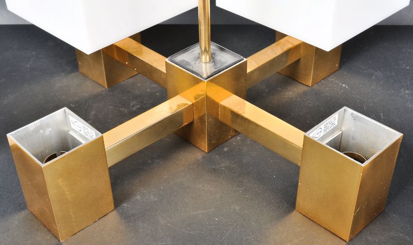 A retro 20th Century Italian influenced hanging ceiling light / chandelier  having a brass effect central column with four protruding straight arms each with a square white acrylic shade. Sold as untested by ourselves. Measures approx; 44cm x 45cm diameter.