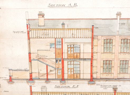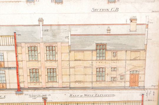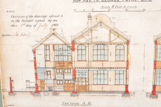 An early 20th Century Edwardian architectural hand drawn in pencil and ink with coloured detailing building plans for St. Antony's Elementary Schools Lancaster Road, Forest Gate. The one off drawing was produced for Rev. Fr. George Payne. O.F.M. Signed and dated 1903 to the lower right by the architect. Framed and glazed. Measures approx; 80cm x 65cm.