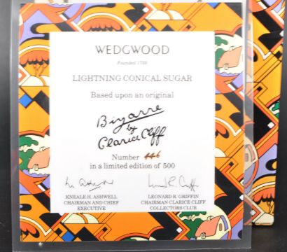 A Wedgwood Clarice Cliff Lightning Conical Sugar sifter / shaker from the Biyanne range. Hand painted in vibrant Art Deco colours with conical shape and having holes to top and base. Marked to base. Complete with certificate and box (446/500). Measures approx; 14cm tall. No visible damage.