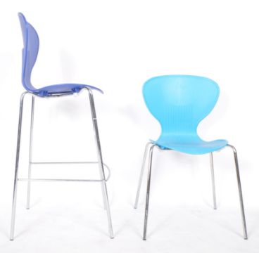 Rochester Poly Keeler, a set of four 20th Century chairs, made from fibreglass reinforced polypropylene of three colour types. With a classic hourglass shape, and a ribbed back and a tubular stacking frame, finished polished chrome,   Chairs measure approx: 83cm x 37cm x 44cm. Together with a blue high stool of similar make and design, 112cm x 37cm x 44cm.