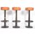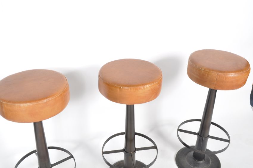 Nkuku - A matching set of six contemporary high end designer bar stools. Each stool having Narwana tan brown leather upholstery to the circular padded seats raised on rustic iron frames with footrests. Each stool original bought new at £195.00 each. Each stool measures approx; 78cm x 34cm diameter.