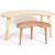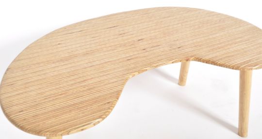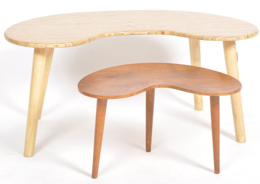 A retro 20th Century Kidney shaped low table, pressed ply top and beech legs. 91cm x 40cm x 46cm. Together with a similar mahogany table of smaller proportions, 31cm x 51cm x 34cm.