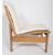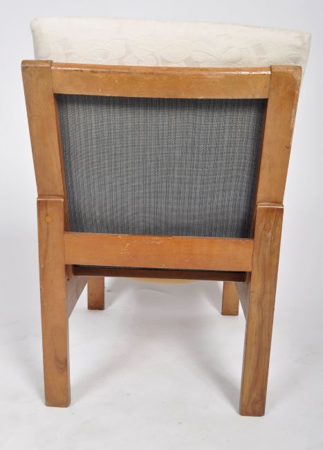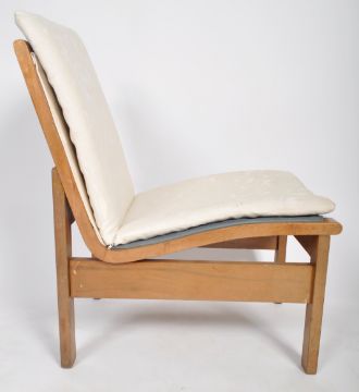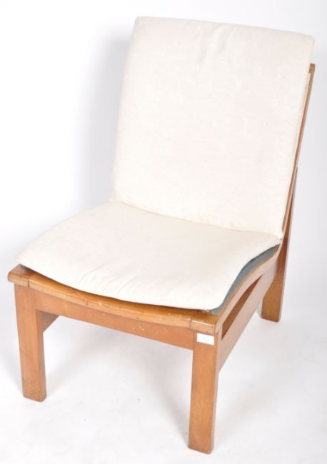 A retro mid 20th Century teak framed easy lounge chair / cocktail bedroom chair having a boomerang shaped seat and backrests with cream upholstered cushions. All raised on straight leg supports united by stretchers. Wear commensurate with age. Measures approx; 76cm x 51cm x 66cm.