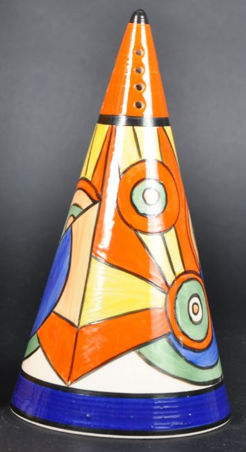 A Wedgwood Clarice Cliff Sliced Circle Conical Sugar sifter / shaker from the Biyanne range. Hand painted in vibrant Art Deco colours with conical shape and having holes to top and base. Marked to base. Complete with certificate and box (366/500). Measures approx; 14cm tall. Chip to base.