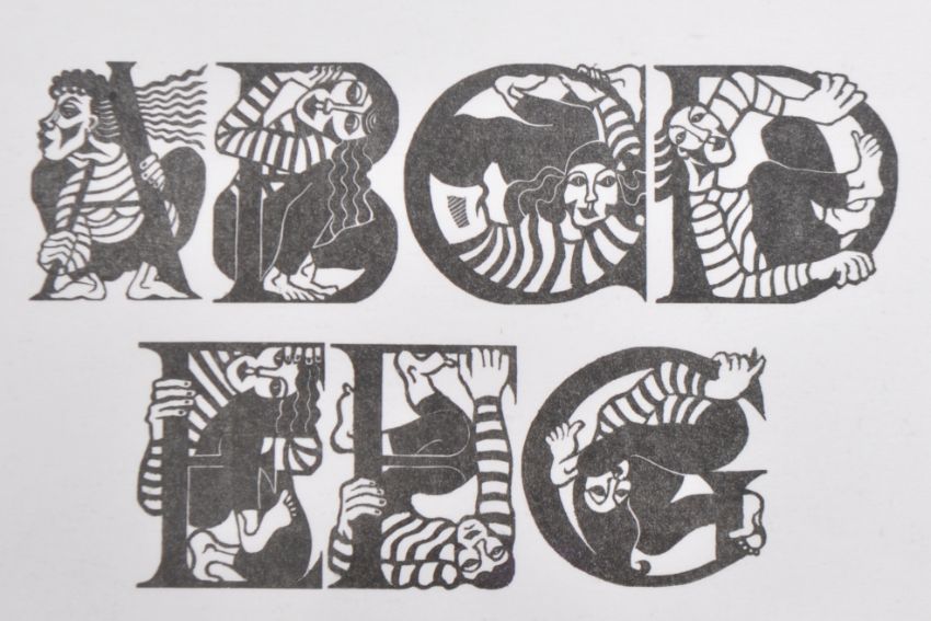 Barbara Crow (British b.1942) -  An Acrobatic Alphabet - A vintage 20th Century limited edition woodblock print on handmade paper. Limited edition signed, titled and number 24/70 in pencil. Framed and glazed. Measures approx; 101cm x 48cm.