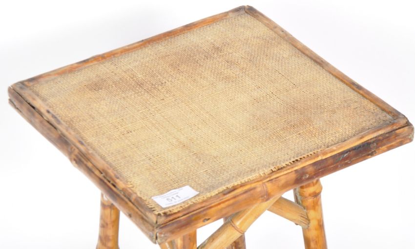 An early 20th Century Aesthetic movement bamboo side table / occasional table. Comprises a rattan square top raised on shaped cylindrical bamboo legs and supports. Measures approx; 63cm x 29cm.