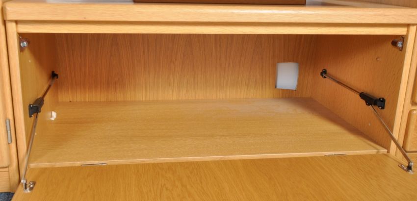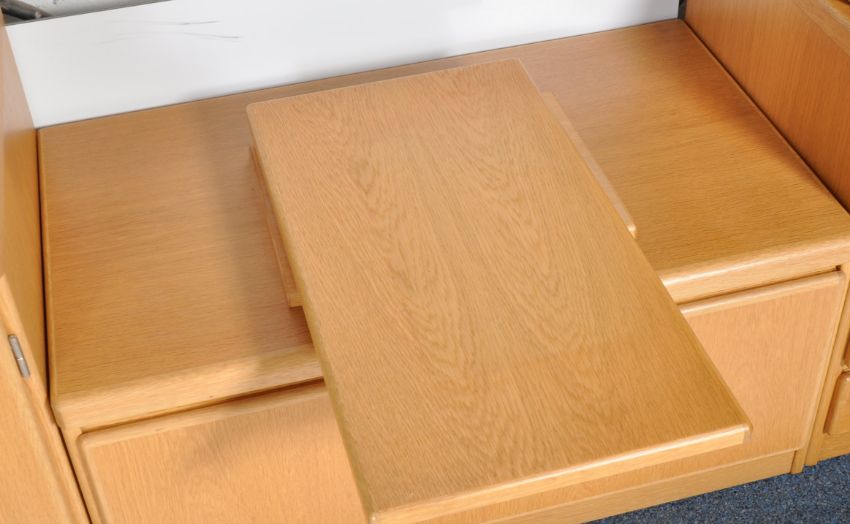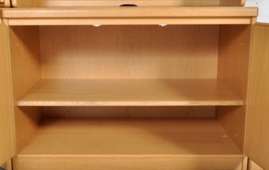 Omann Jun - A 20th Century Danish modern design oak modular living room suite / room unit comprising a corner cabinet on cupboard base, central cabinet / cocktail drinks cabinet supported by twin door cupboard base, floating wall mounted shelf with TV cabinet below, to the right a wall mounted hanging cabinet with full length glazed door and multi drawer chest below. Glass shelves set throughout. Overall measures approx; 194cm x 290cm x 52cm.