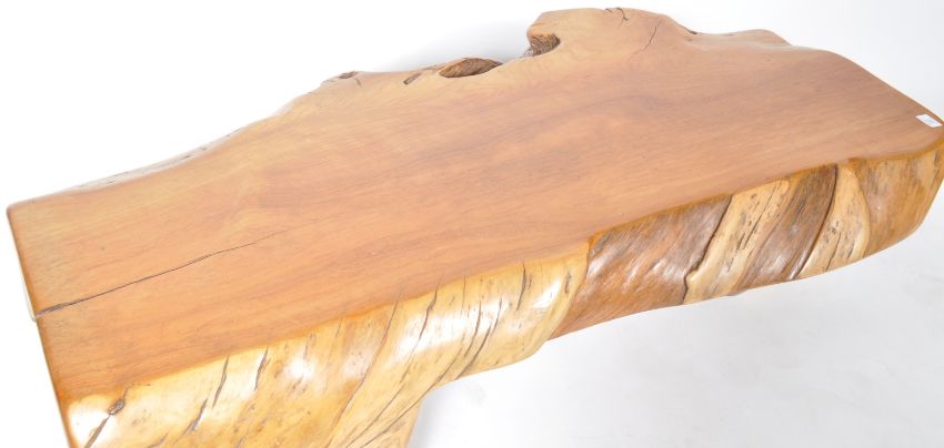 A 20th Century retro vintage naturalistic living edge low coffee table. Comprises natural lumber top with polished 'live' edge raised on shaped supports. Carved from a single piece of wood. Measures approx; 43cm x 140cm x 73cm.