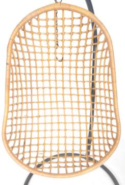 A retro late 20th Century hanging basket chair / pendulum chair of wicker construction. The pierced egg shape form chair hanging from a metal hook atop the main support attaching to a metal stand. The stand terminating into a rounded tubular base. Measures approx; 183cm x 103cm.
