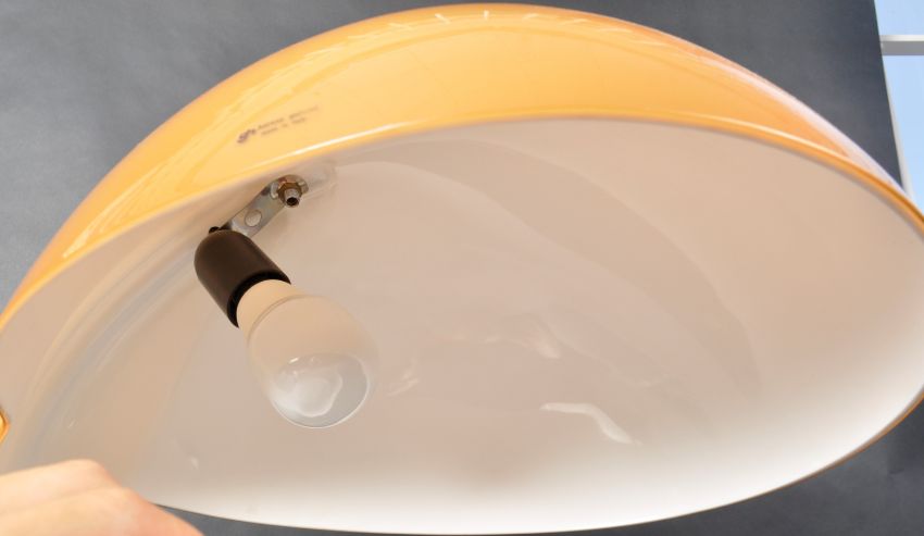 Luigi Massoni for Harvey Guzzini - Fiona Lamp - A retro 20th Century 1970s Italian design table lamp light of shaped from with curved chrome arm support. Methacrylate construction in light brown colourway with white interior. Measures approx; 38cm x 32cm.