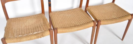 Niels Møller for J L Møllers Møbelfabrik - Model 75 - A matching set of four mid 20th Century Danish design teak and rattan dining chairs / side chairs. Each chair with curved shaped backrests, rattan woven seat rests with each raised on tapering legs. Labels to the underside. Together with a spare example having damaged backrest. Each chair measures approx; 75cm x 50cm x 41cm. Matching table can bought in lot 52.