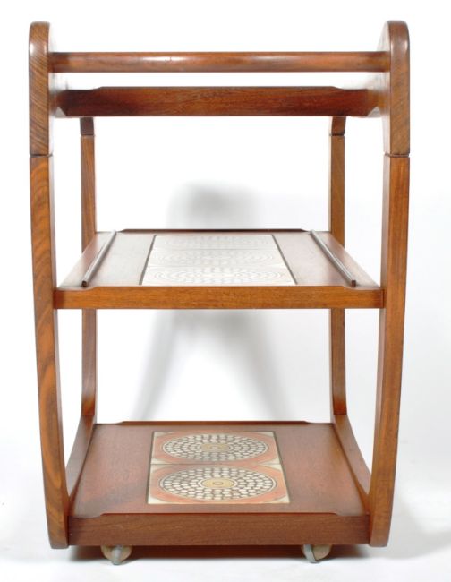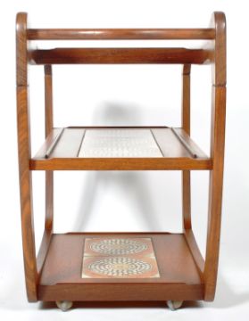 A retro mid 20th Century Danish influenced teak three tier cocktail drinks / tea serving trolley having boomerang supports with central inlaid tiles to each tier. All raised upon castors. Measures approx; 73cm x 78cm x 46cm.