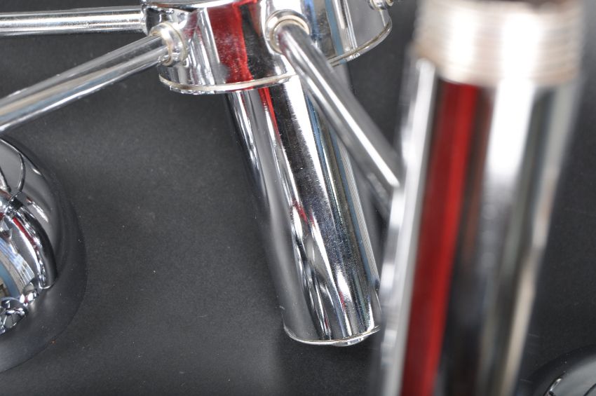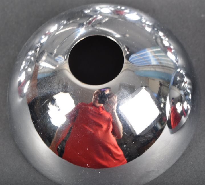 A retro 20th Century hanging ceiling light / chandelier having a single central chrome stem with ceiling bracket and series of six arms protruding out with domed chrome shades to the top and bottom of each. All in the manner of Kaiser Leuchten. Measures approx; 59cm x 56cm diameter.