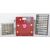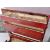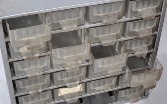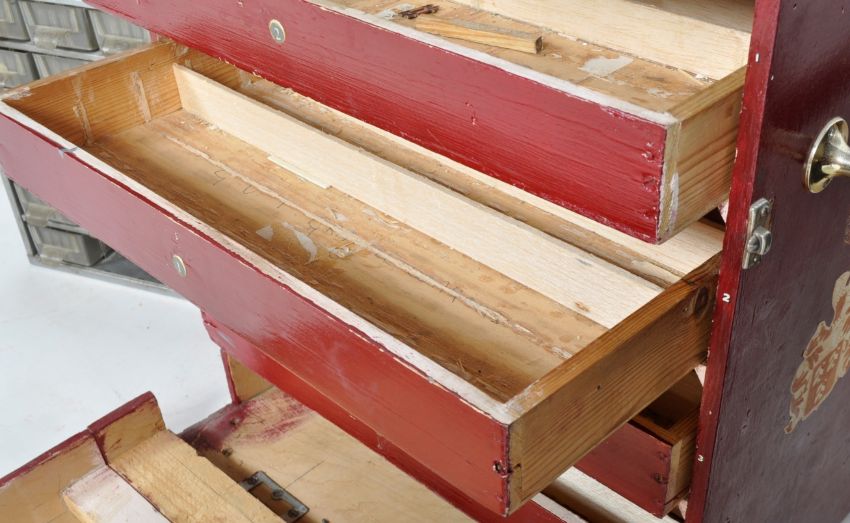 A collection of vintage engineers tool cabinets comprising a large red painted woode example with fall front opening to reveal a series of long drawers along with two metal cased sectional cabinets with plastic drawers / compartments. Measures approx; 45cm x 43cm x34cm.