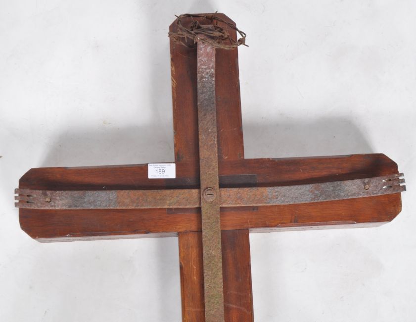 A large 20th Century Ecclesiastical stained oak religious cross / crucifix having chamfered edges and iron mounting bracket to the verso. Measures approx; 119cm x 54cm.