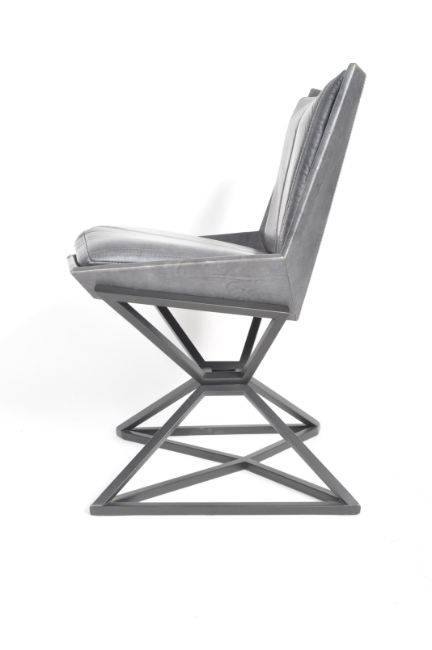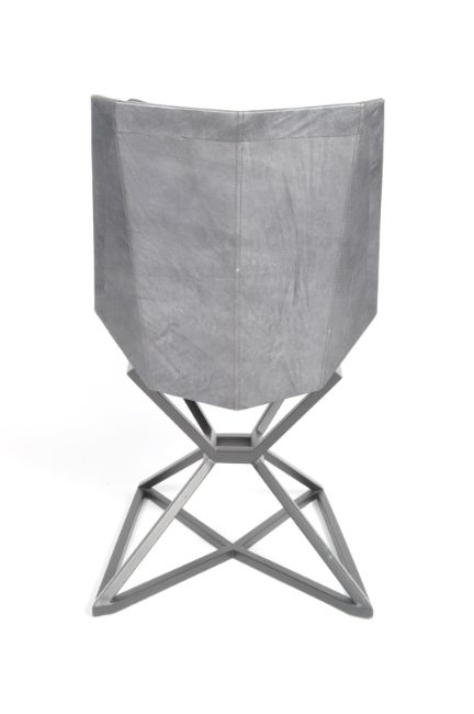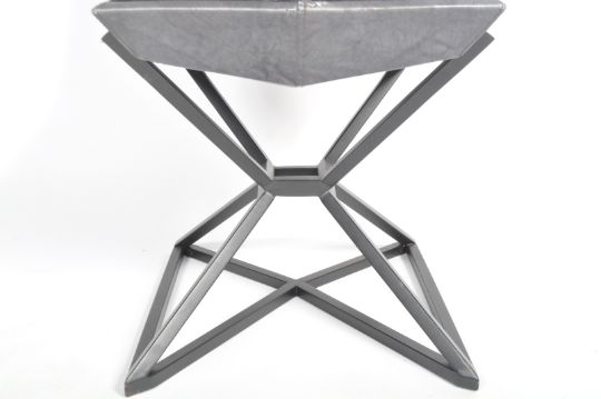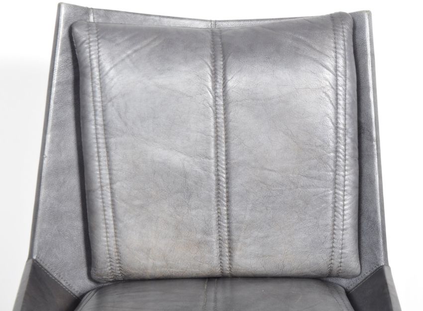 A retro contemporary 20th Century modernist industrial form & function side desk chair / accent chair. Comprises a silver leather seat and back rest raised on double open prism black metal architectural base. Measures approx; 79cm x 48cm x 44cm.