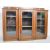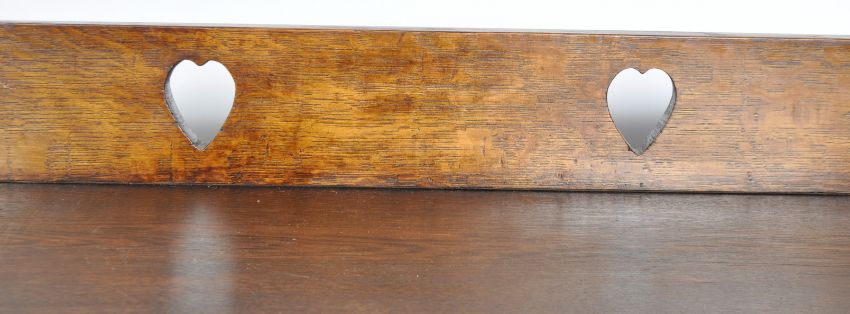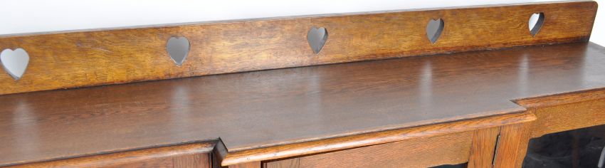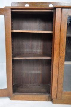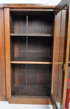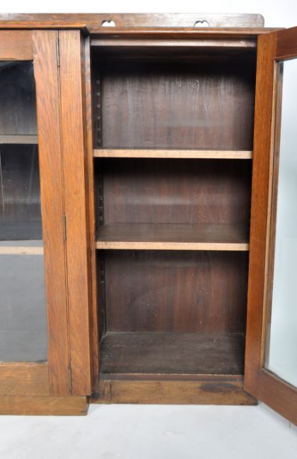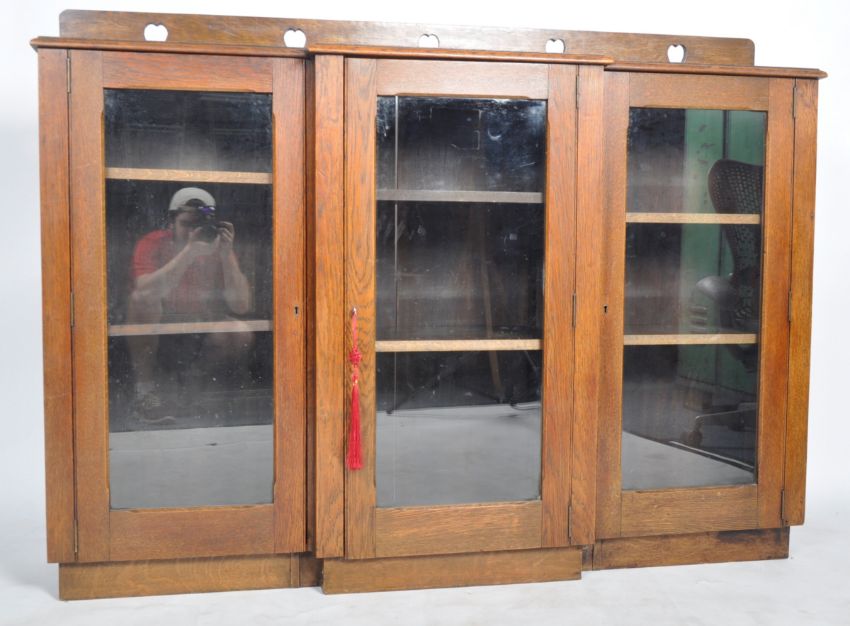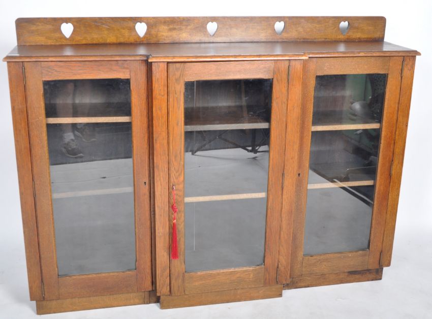 An late 19th Century Arts & Crafts oak breakfront display cabinet / bookcase having a raised gallery back with carved heart decoration. Single fronted glazed door flanked by further glazed doors to each side with all having shelved interiors. All raised on a plinth base. Measures approx; 122cm x 166cm x 33cm.