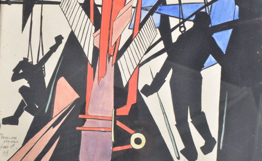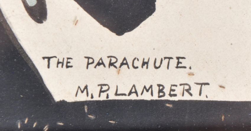 Morris P. Lambert (American b.1904 - 1969) - The Parachute - An early 20th Century watercolour on paper painting depicting planes and parachutists with dark tones and red and blue highlights. Dedicated to Penelope Spencer, dated June 9th 1919 and signed and titled to the right. Framed and glazed. Measures approx; 58cm x 40cm.
