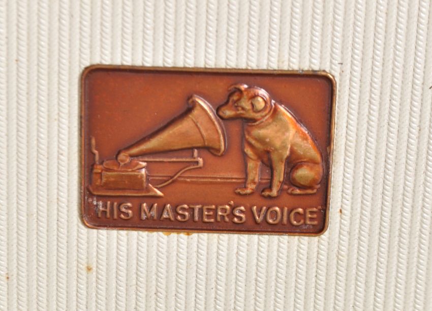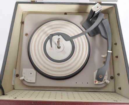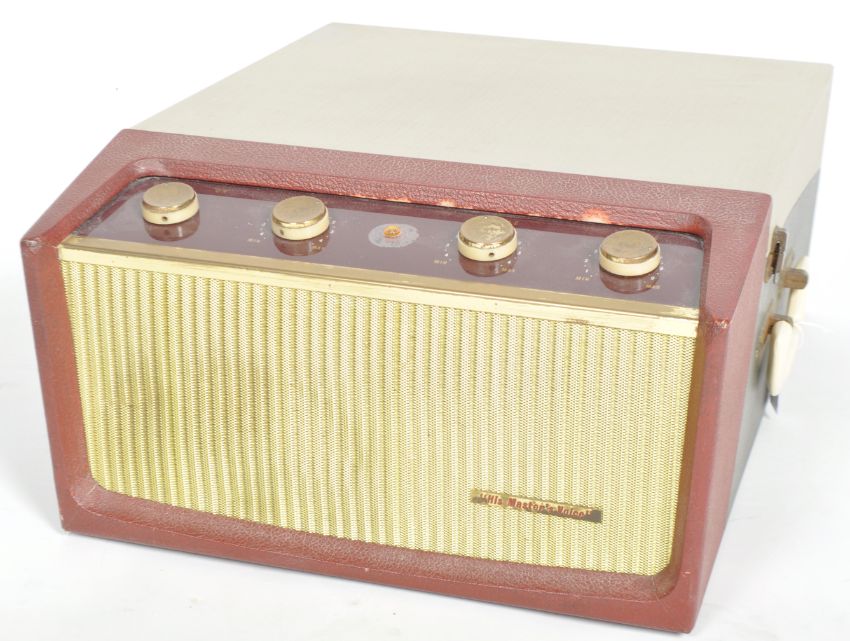 A retro vintage mid 20th Century 1950s HMV - His Master's Voice two tone portable record player. The red and cream vinyl case with BSR turntable record deck. Untested by ourselves. Measures approx; 22cm x 42cm x 50cm.