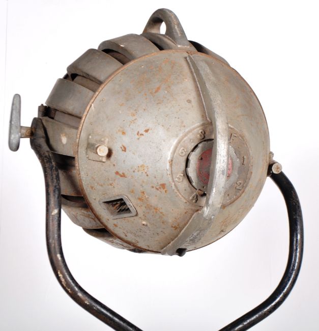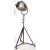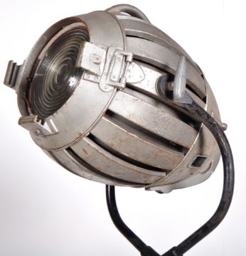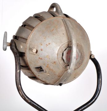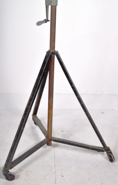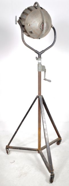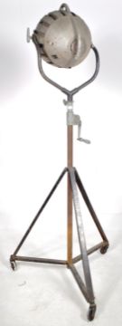 Hewitt Universal - Multiple Industries Ltd - A large industrial retro vintage 20th Century floor standing theater / industrial lamp light having a space age cast metal shade with thick banded glass insert. Raised on a swing mount upon a single stem with tripod stand upon castors. Makers marks to the verso of the light. Measures approx; 204cm.