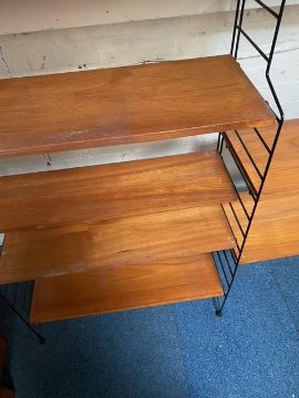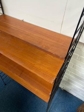 Brianco - An original retro vintage 20th Century teak wood Ladderax type modular wall shelving system comprising of four black metal uprights (three bays) with a series of adjustable teak shelves. Each shelf with metal hooks. Measures approx; 181cm x 228cm x 33cm.