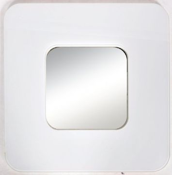 A contemporary wall mirror by Morris Mirrors of Tottenham London. The central mirror panel having a rounded square edge set within white plastic frame. Label to verso. Measures approx; 80cm x 80cm.