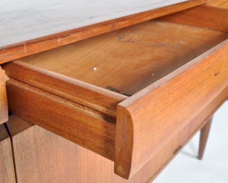 RHF Royal Heritage Sideboard - Elliotts of Newbury - EON - an original retro vintage 1960s teak wood sideboard credenza comprising three drawers above a central fall front cocktail cabinet flanked by a single cupboard to each side. One drawer fitted with cutlery compartment and shelves to each section. Cutlery drawer divider loose put present and one shelf peg missing. Top has been lacquered and some wear commensurate with age. Measures approx; 76cm x 168cm x 45cm.