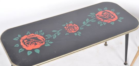 A vintage 1960 glass top low coffee / cocktail table with flower motifs, supported on Scandinavian four leg base that can be unscrewed. 41cm x 92cm x 39cm. Together with a pastel green topped gold coloured trim German side table supported on four beech legs, 41cm x 63cm 33cm.