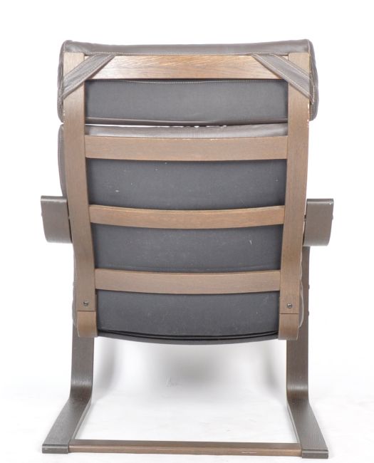 Ikea - Poang - A contemporary Swedish design bentwood cantilever armchair / easy lounge chair having removable headrest cushion with stitched brown leather padded upholstery. Brown wooden frame with makers label to the underside. Measures approx; 100cm x 68cm x 70cm.