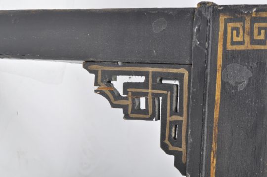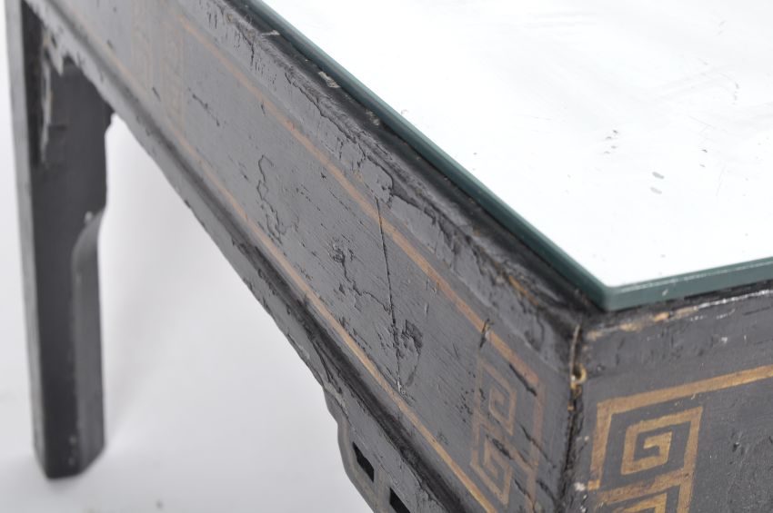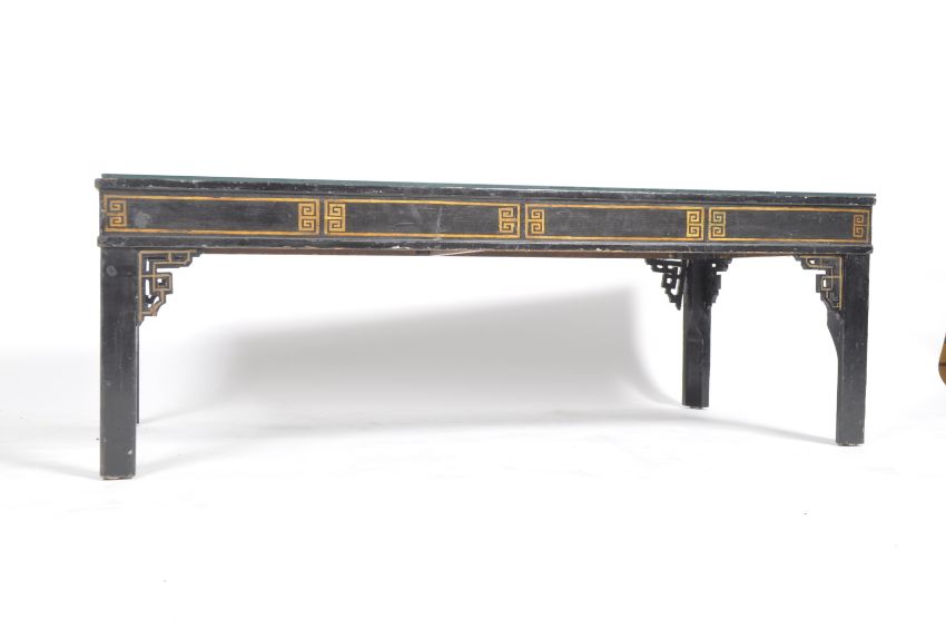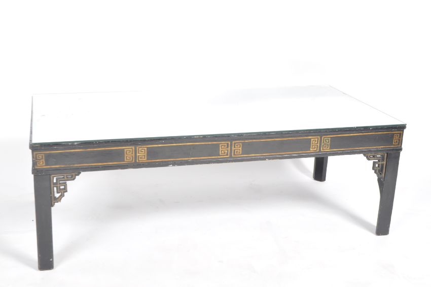 A vintage 20th Century Chinese ebonised coffee table / low table of simple rectangular form having a later applied mirrored glass top. All raised on a straight leg supports with stenciled Greek key decoration throughout. Wear commensurate with age. Measures approx; 45cm x 129cm x 65cm.