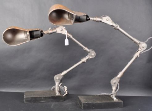 Fostoria - a pair of 1960s American Pressed Steel Localite Machinists Lamps, stamped steel construction, triple joint, adjustable at three points, with a switch button to shade. Mounted on a solid slate base. Measures approx: 62cm x 50cm x 13cm.