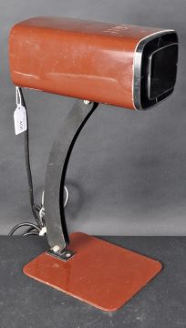 A bedside / desk lamp light, a rectangular brown shade supported on a black curved tilt arm, on a flat rectangular base, with switch to cord. Measures approx; 38cm x 20cm x 13cm.